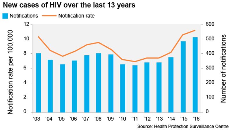 More than 500 new cases of HIV were diagnosed, the highest rate since records began. Rates have been rising steadily since 2011, with the rate of new infections increasing significantly within the past two years.