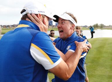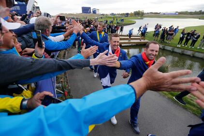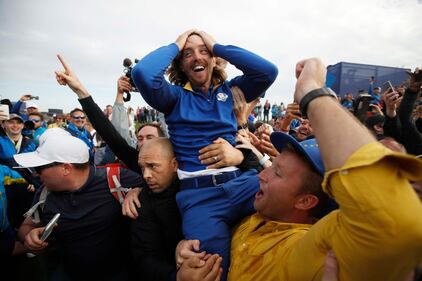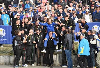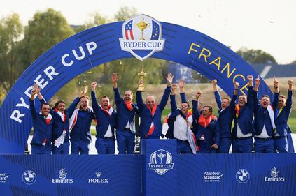 Europe celebrates winning the 2018 Ryder Cup at Le Golf National in Paris.