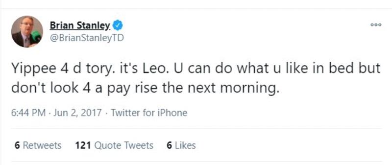 Sinn Féin defended Mr Stanley in relation to his tweet about Mr Varadkar, backing his defence that there was no homophobic innuendo or intention behind it.