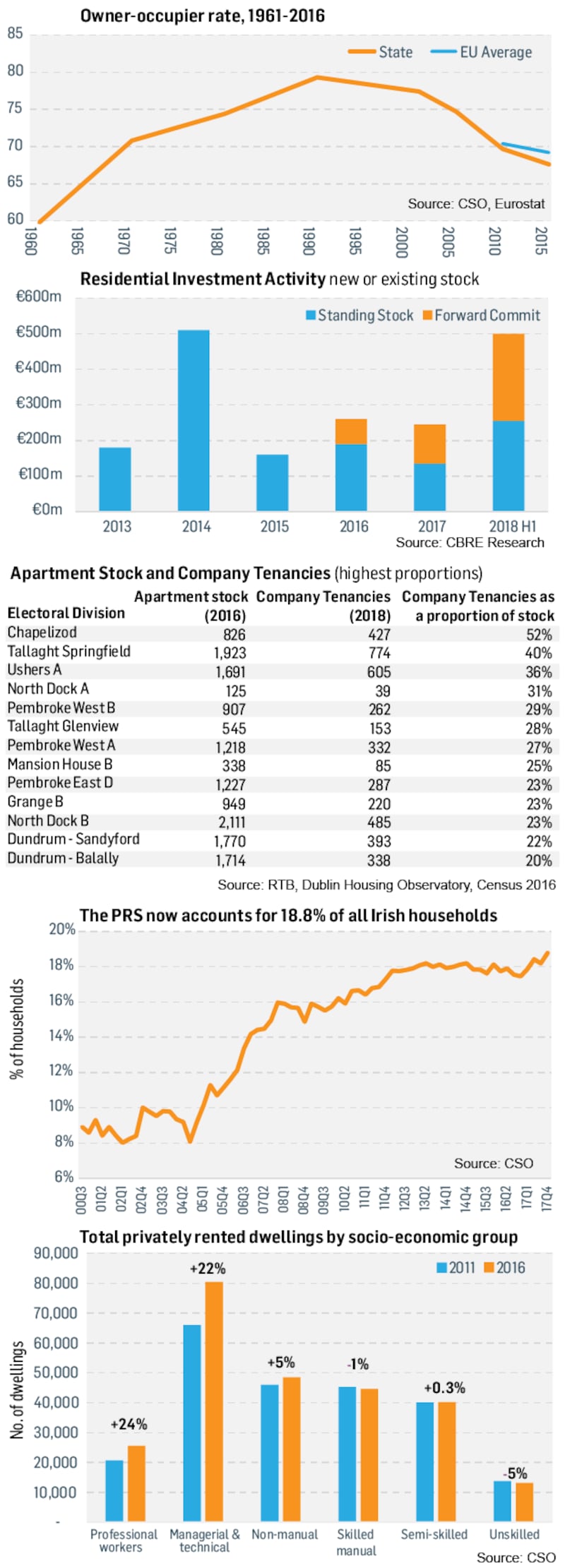 In 20 areas in Dublin city, more than 20 per cent of apartments were rented out by companies. In 2017 more than 40 per cent of all new apartments in the State were bought by firms categorised as being in the financial and insurance or real estate sectors.