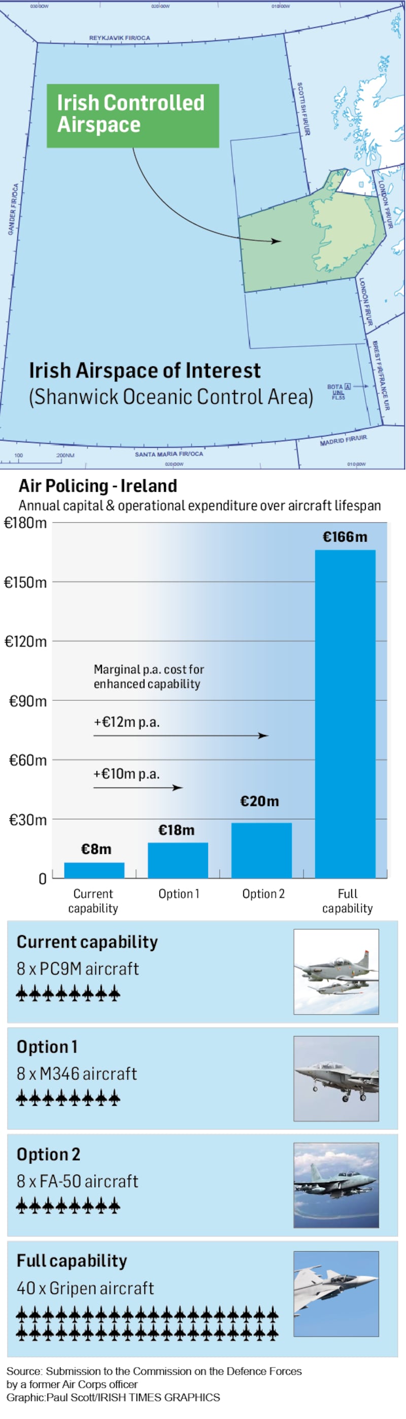 However, others believe the cost could be much lower. According to one unpublished submission to the defence commission from a retired senior Air Corps officer, Ireland could build an air policing capacity for an initial outlay of less than €40 million a year.