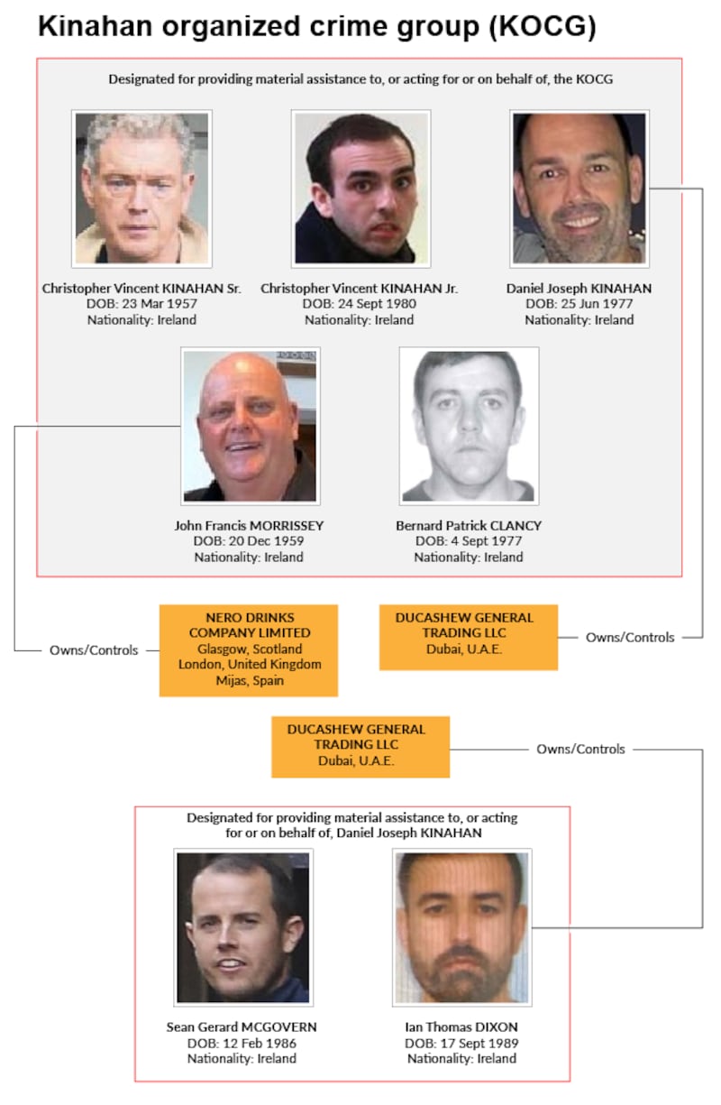 Also named, and sanctioned, are their close associates in the cartel and businesses they have an interest in, including a stake in a major UK-based drinks company that the Americans state was given to Daniel Kinahan to repay him when drugs were seized by law enforcement. Two UAE-based sports companies are also at the centre of the sanctions.