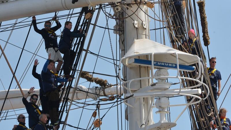 Dozens of trainees and crew took to the crow's nest and foremast on the century-old Norwegian steel barque to bellow out the lyrics to the Girls of Dublin Town, Haul Away Joe, Dance the Polka and South Australia.