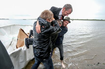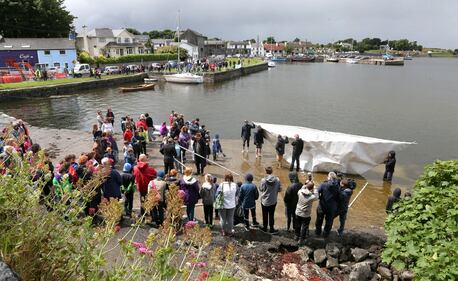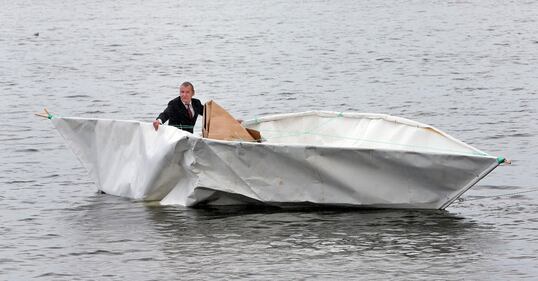 Artist Frank Bolter sets sail in his life sized paper boat made with the boat-making community in Kinvara