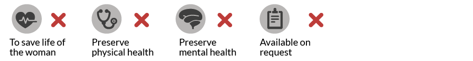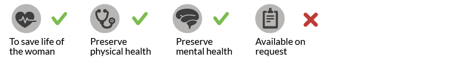 Abortions are not permitted at the request of the mother. Abortions are legal to save the life of the pregnant woman, to preserve physical or mental health of the woman, following rape or incest, or to in the event of foetal impairment.