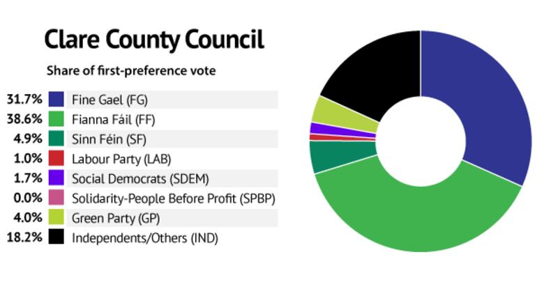 Fianna Fáil has increased its number of seats on the 28-seat Clare County Council after increasing its share of first preference vote by 3 per cent to 39 per cent.