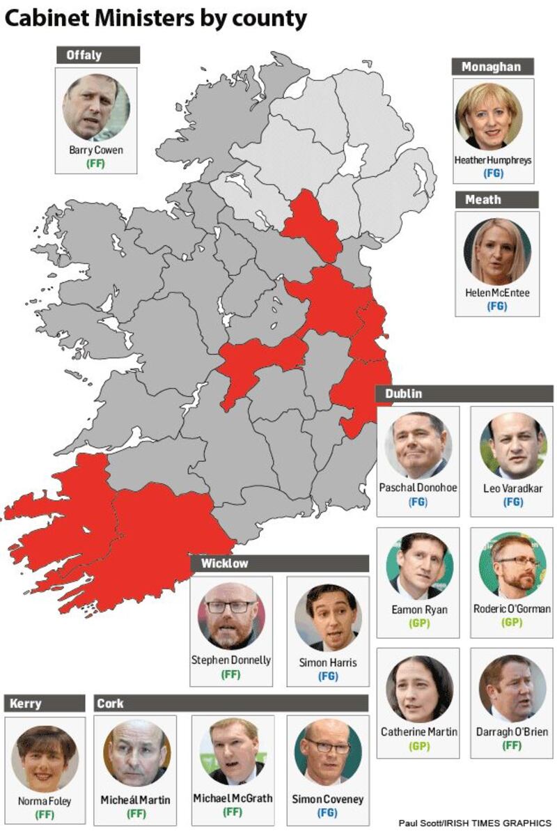 Ministers were yesterday forced to defend and explain a Cabinet with 12 members from Dublin, the East Coast and Cork. There is no senior Minister from Connacht.