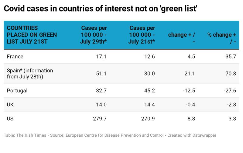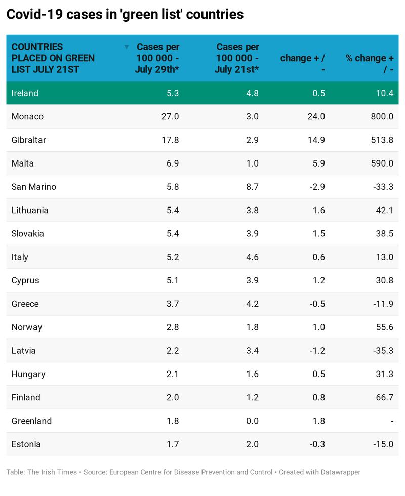 Other countries on the green list, announced late on July 21st, which have seen an increase include Cyprus from 3.9 to 5.1, Italy from 4.6 to 5.2, Lithuania from 3.8 to 5.4 and Slovakia from 3.9 to 5.4.