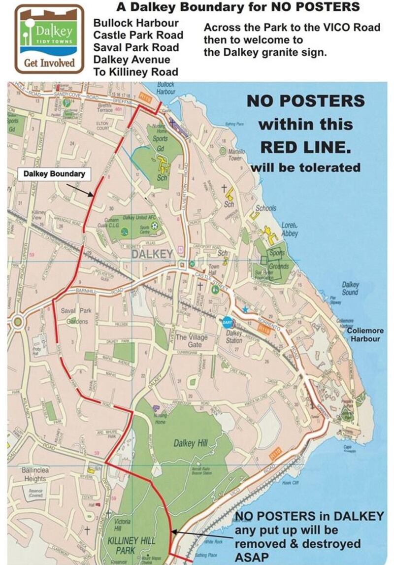 The email includes a map outlining the Dalkey boundary, with a warning that any election posters found inside would be removed.