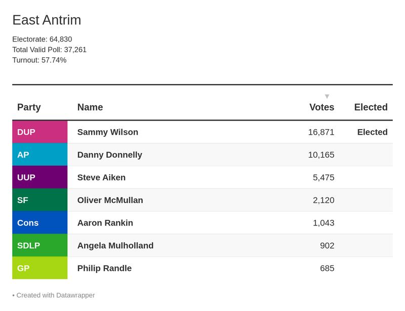 Mr Wilson, who has held his seat since 2005, won comfortably, although he saw his majority drop after a strong showing by the Alliance Party's candidate, Danny Donnelly. Mr Wilson had a majority of close to 16,000 in the 2017 election, but that lead dropped to just over 6,700 in this contest. Mr Donnelly polled 10,165 votes, compared with the almost 6,000 votes won by the Alliance candidate, Stewart Dickson, two years ago, again reflecting the "Alliance surge" that was a feature of this election.
