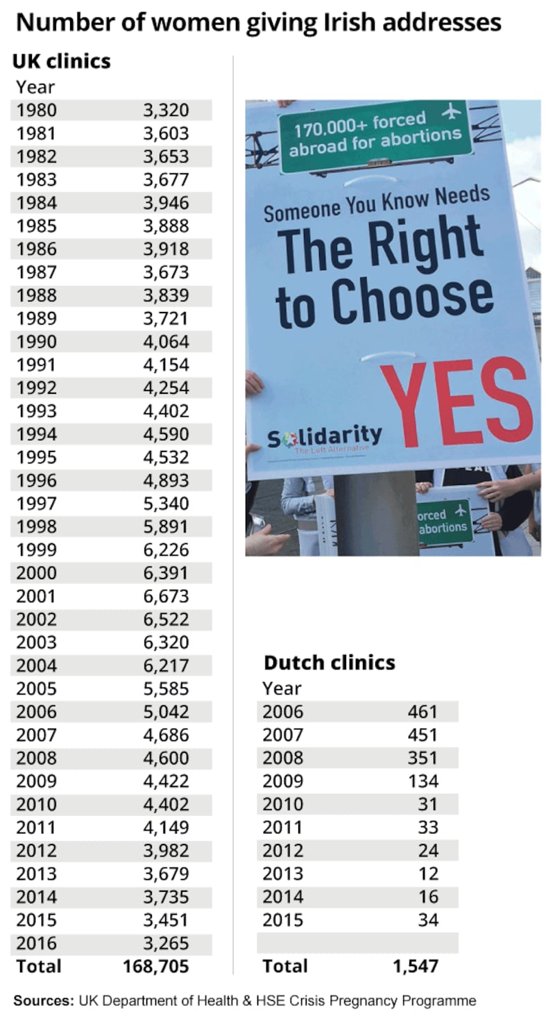 The figure also includes women who have travelled to the Netherlands, she added. Ms Coppinger said the figure used by Solidarity is quite conservative as many women do not give their proper address to clinics they attend in the UK or elsewhere for abortions.