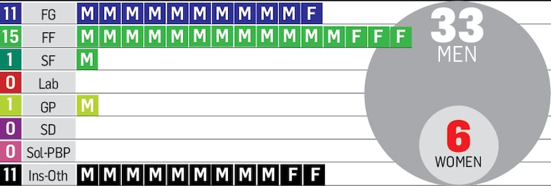 In Ballinasloe, Fianna Fáil’s Michael Connolly and Independent candidate Tim Broderick comfortably exceeded the quota and were both elected on the first count, with Sinn Féin’s Dermot Connolly taking a seat on the seventh count. Independents Aisling Dolan and Declan Geraghty were elected on the eighth count along with Peter Keaveney of Fine Gael, who survived the switch from the Tuam area.