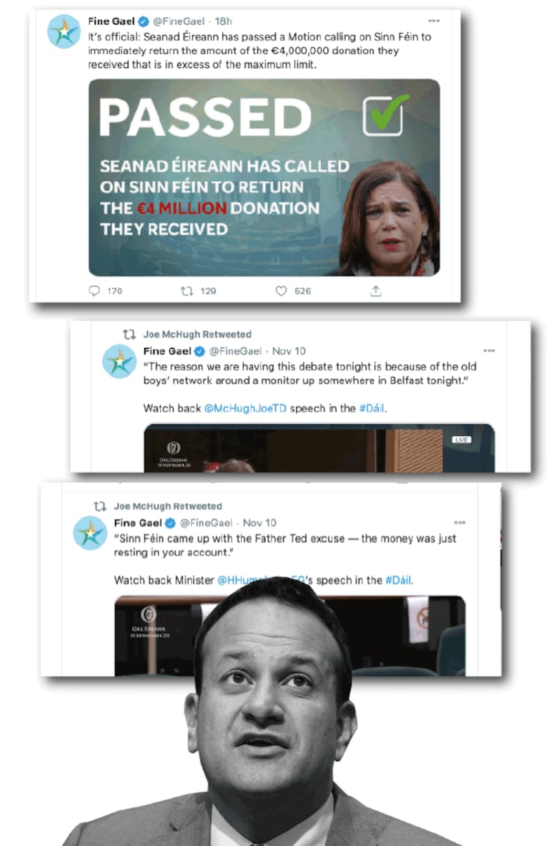 Fine Gael believes Sinn Féin tabled the Varadkar motion to deflect from their own difficulties in the North over the erroneous payment of £30,000 in Covid-19 supports to three of its offices by a Stormont department. The money has been repaid.