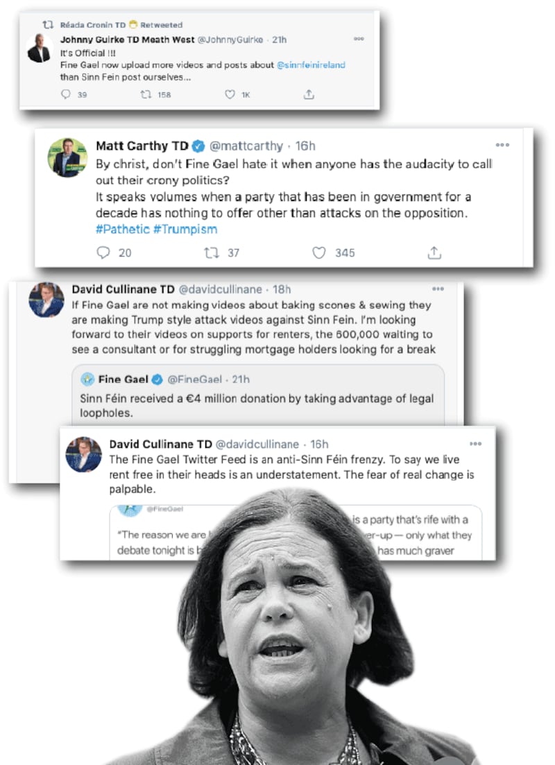 Sinn Féin responded in kind. “The Fine Gael Twitter feed is an anti-Sinn Féin frenzy” observed David Cullinane, expressing pleasure that Sinn Féin “is living inside Fine Gael’s head”.
