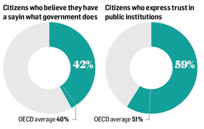 There are high levels of public satisfaction with policing (77 per cent, compared to 78 per cent across the OECD) and education (76 per cent compared to 68 per cent). However, levels fall to 66 per cent for healthcare (compared to 71 per cent generally), and the judiciary (67 per cent, compared to 57 per cent).