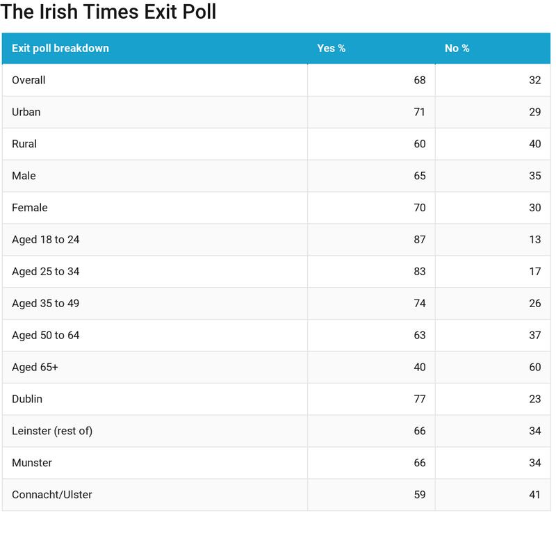 Among the youngest voters, support for the change was overwhelming – the poll finds that 87 per cent of those aged 18-24 voted for repeal.