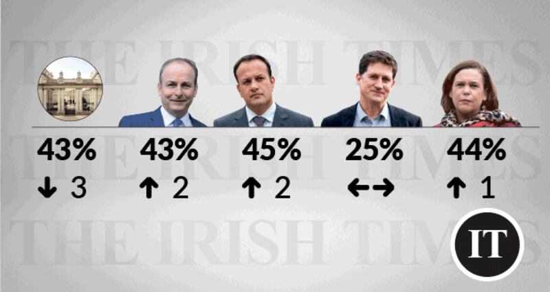 Satisfaction with the Government has fallen by three points to 43 per cent. The ratings of the party leaders sees little change, with Taoiseach and Fianna Fáil leader Micheál Martin up two to 43 per cent; Fine Gael leader and Tánaiste Leo Varadkar up two to 45 per cent; and Ms McDonald up one to 44 per cent.