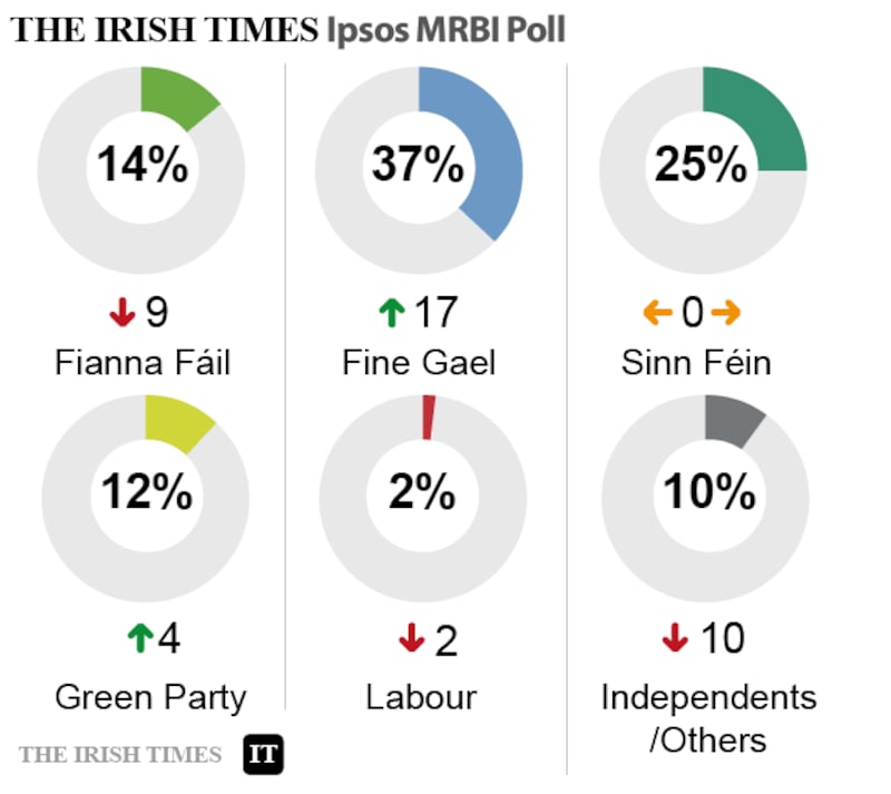 The party support figures are as follows: Fine Gael 37 per cent (up 17); Fianna Fáil 14 per cent (down nine); Sinn Féin 25 per cent (no change); the Greens 12 per cent (up 4); Labour two per cent (down two); Independents and others, including smaller parties, 10 per cent (down 10).