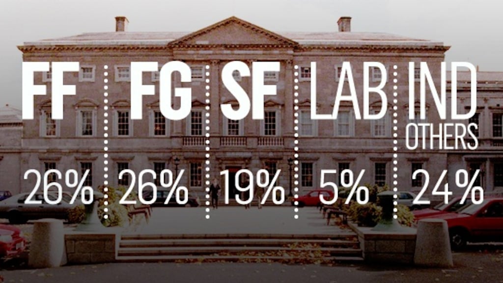 When people were asked who they would vote for in a general election, party support – when undecideds were excluded – compared with the result of the last poll in July was: Fine Gael, 26 per cent (up two points); Fianna Fáil, 26 per cent (down seven points); Labour, 5 per cent (no change); Sinn Féin, 19 per cent (up three) and Independents/ Others, 24 per cent (up two).