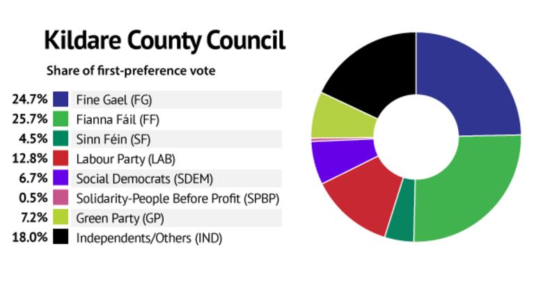 Green Party success continued in Maynooth and Naas where Peter Hamilton and Vincent Martin took seats. After a long count in Naas, Bill Clear of the Social Democrats took one of seven spots.