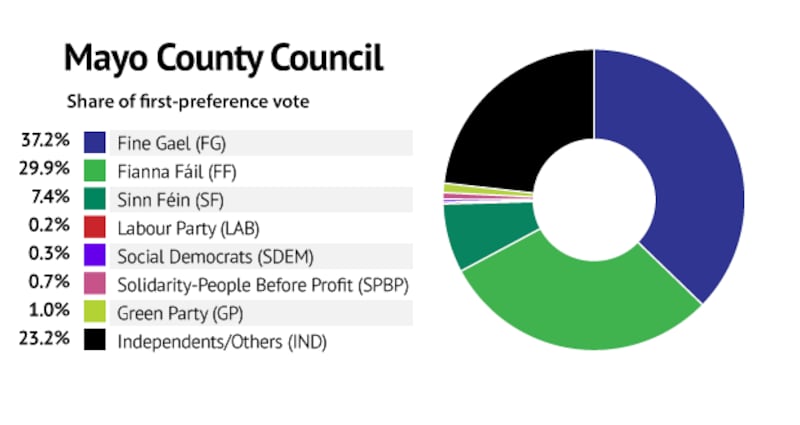 The Claremorris result sees Fine Gael take 12 out of the 30 available seats on Mayo County Council. Fianna Fáil secured 11, Independents took seven seats and Sinn Féin will just have one representative in the council chamber. Despite running five candidates across six electoral areas, Cllr Gerry Murray, who topped the poll in Swinford, was Sinn Féin’s only success story in Mayo.