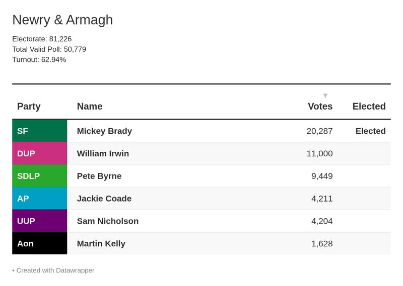 Newry and Armagh was a comfortable win for Mickey Brady of Sinn Féin, the constituency’s MP since 2015. It has been in Sinn Féin hands since 2005; this Border constituency, with a large Sinn Féin majority, was always going to be a safe seat for Brady.