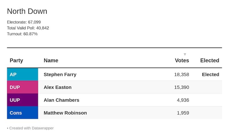 Alan Chambers of the Ulster Unionist Party had been seen as the third challenger for the open seat, but he polled well short of the hunt, on 4,936 votes. Turnout in North Down was 60 per cent, with 40,643 valid votes cast.