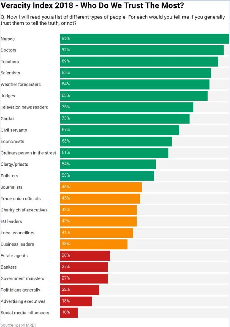 Civil servants are at 67 per cent, while economists are at 63 per cent - just ahead of the “ordinary person in the street”, who is trusted by just 61 per cent of people.