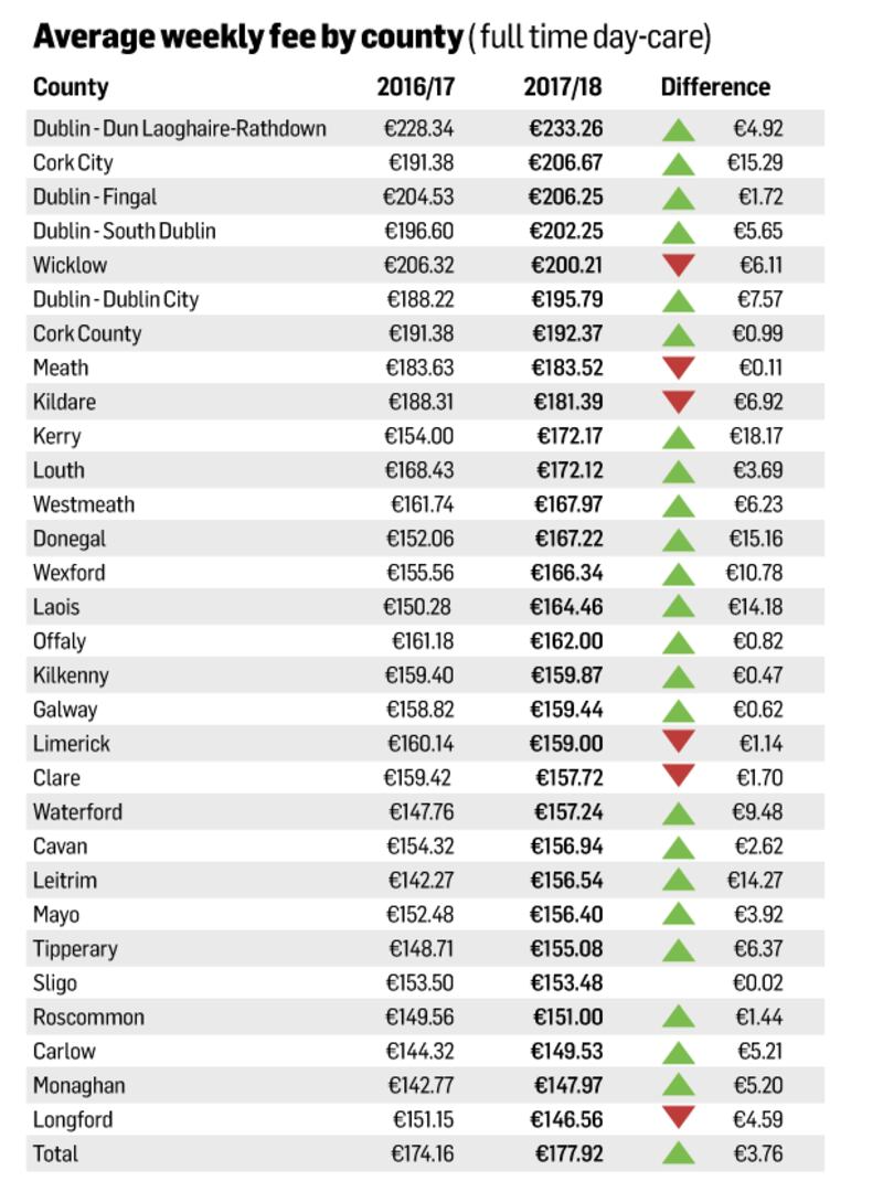 A county-by-county breakdown shows that in Cork city and Co Donegal, full-time fees have increased by up €15 a week. However, in some counties the average fee has dropped, with Co Kildare showing the biggest weekly decrease of almost €7.
