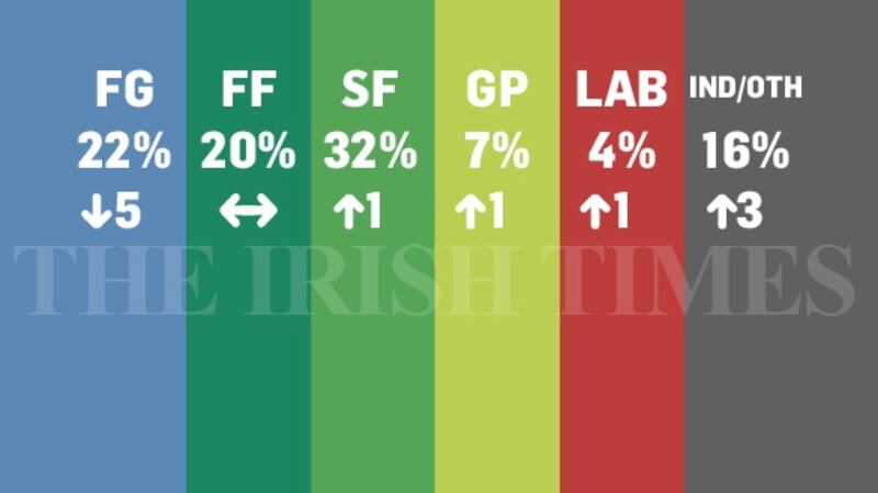 One small step for Sinn Féin – up one point to 32 per cent – is enough to establish a considerable 10-point lead on Fine Gael, who drop five points to 22 per cent in the latest Irish Times/Ipsos MRBI poll.