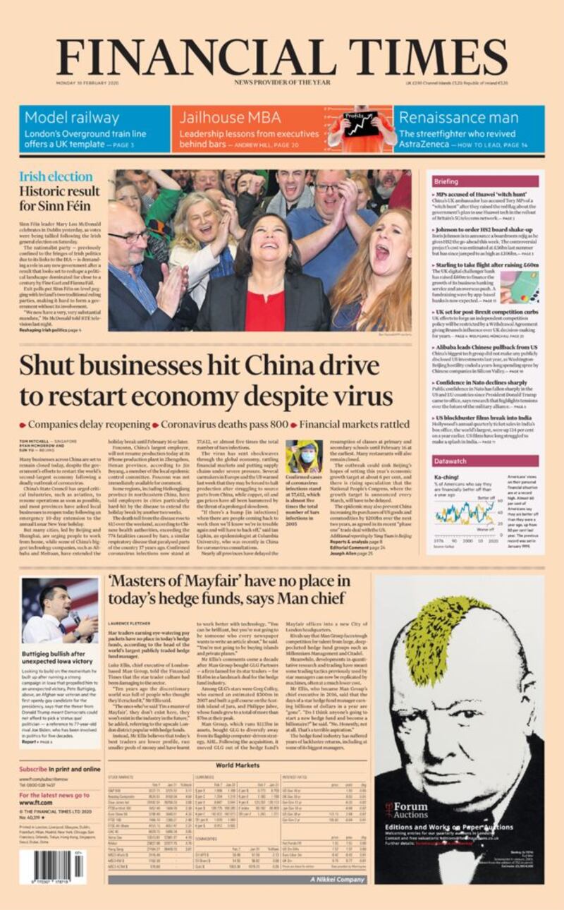 The party's victory is covered on the front page of the Financial Times with the headline "Irish election - Historic result for Sinn Féin". The paper's main picture was of party leader Mary Lou McDonald celebrating her success after she was elected on the first count for Dublin Central on 11,223 votes with a quota of 6,288. Its news piece reports how "Sinn Féin has demanded a role in Ireland's new government after surging to the highest vote share in a seismic general election that will make it hard for the country's traditional ruling parties to govern without it. The nationalist party's breakthrough in Saturday's election following decades on the fringes of politics is likely to leave Dublin facing political deadlock."