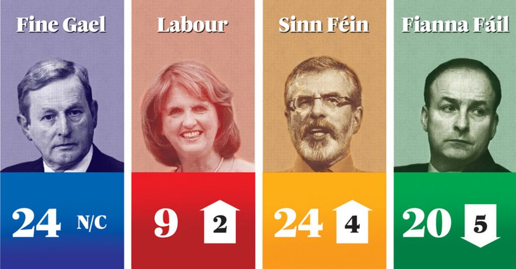 The core vote for the parties – before undecideds are excluded – compared with the last poll was: Fine Gael, 19 per cent (up one point); Labour, 7 per cent (up two); Fianna Fáil, 16 per cent (down three); Sinn Féin, 18 per cent (up three); Independents/Others, 17 per cent (down one) and undecided voters, 23 per cent (down two).