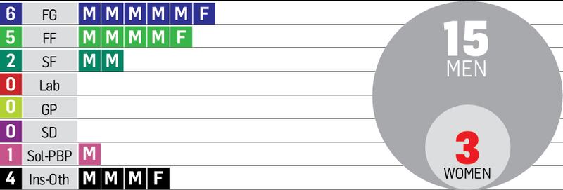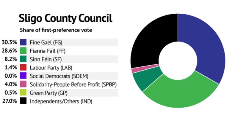 After a very close finish when just a handful of votes separated the last two candidates, Fine Gael was lucky to double its number of seats on Sligo county council from three to six. Fianna Fáil has dropped from seven to five seats while Sinn Féin held onto its two seats .The new 18-strong council includes four Independents and one People Before Profit councillor.