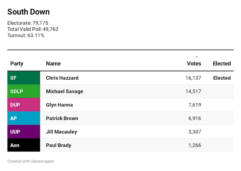 The outgoing MP Chris Hazzard, who first won this seat from the SDLP two years ago, has regained it for Sinn Féin with a majority of just over 1,600 votes.