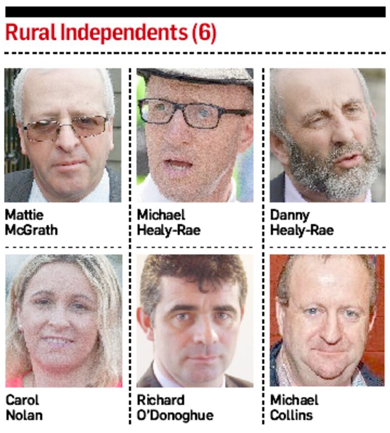 The first comprises the rural Independents, including Mattie McGrath, Michael Healy-Rae, Danny Healy-Rae, Carol Nolan, Richard O’Donoghue and Michael Collins.