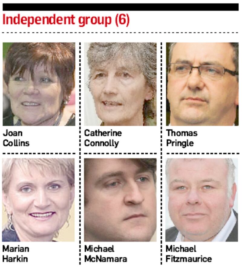 The final group is referred to informally as the Independent group. It includes Joan Collins, Catherine Connolly, Thomas Pringle, Marian Harkin, Michael McNamara and Michael Fitzmaurice.