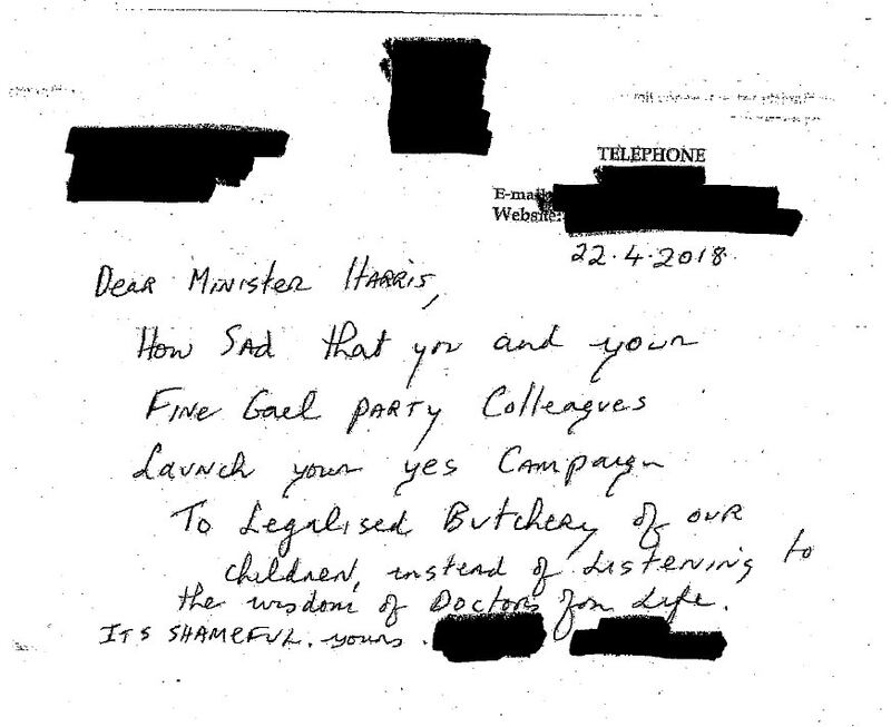 The Minister for Health also received a letter from a person who said abortion should not be permitted when the foetus was “created at a time not suitable for mam and dad or they are not perfect”.