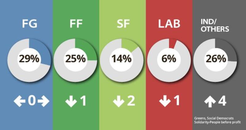 The rest of the core votes are: Sinn Féin 12 per cent (no change); Labour 5 per cent (down one); Greens 6 per cent (up three); Independents/others 15 per cent (no change). Undecided voters are at 20 per cent, down three points since the last poll.