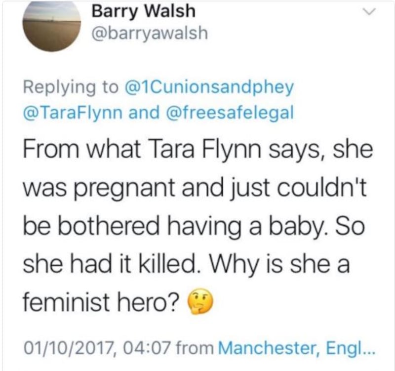 He wrote: “From what Tara Flynn says, she was pregnant and just couldn’t be bothered having a baby. So she had it killed. Why is she a feminist hero?” Ms Flynn tweeted in response: “I’d like to meet Barry Walsh. I don’t expect an apology, but I’d like him to sit across from me and say whatever he has to say.”