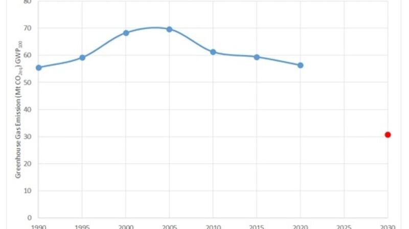 This provides a clear target for emissions reduction to be achieved by 2030, ie Ireland’s GHG emissions should be reduced to at most 31 million tonnes of carbon dioxide equivalent. Figure 1 compares this short-term ambition to Ireland’s historical emissions provides an indication of the scale of the challenge over the next 10 years.