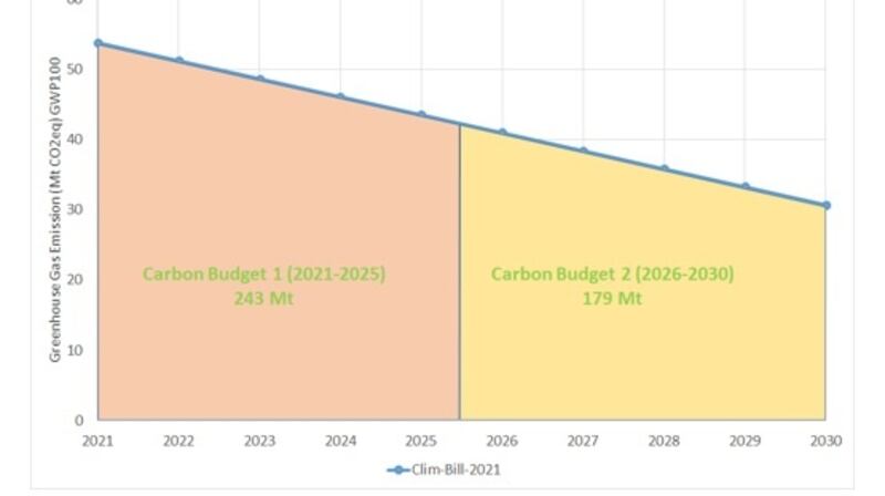 The revised Climate Bill 2021 states the first two carbon budgets “shall provide for a reduction of 51 per cent in the total amount of greenhouse gas emissions over the course of the first two budget periods ending on December 31st, 2030, from the annual greenhouse gas emissions reported in 2018”.