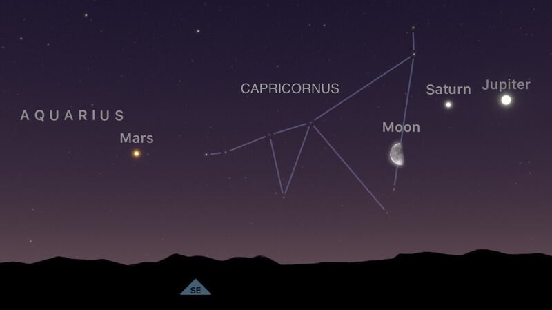 Mars, Jupiter, and Saturn are all late-hour objects. The former rises after 1am at the end of May in Aquarius, with the moon close on the 15th. Jupiter, in the Sagittarius constellation, and Saturn, in Capricornus, both rise just before midnight by the 31st. Jupiter is the brightest star-like object in this area of the sky and is cream coloured. Saturn shows a more yellowish tint and lies a short distance to the left of Jupiter. The gibbous (more than half-full) moon is near both planets during the early hours of the 12th and 13th.