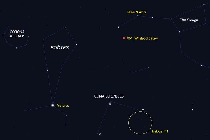 Our southern sky view in May is into the void. A little below the handle of the Plough is the constellation Coma Berenices where you might spot a smattering of faint stars seemingly spread out into braids.