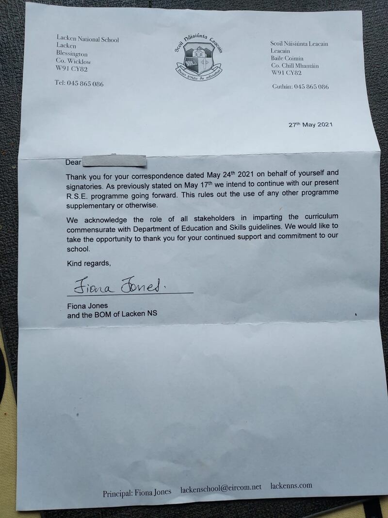 Replying, Lacken principal Fiona Jones and its board of management assured them of an intention to use the existing RSE programme from September 2021 at the school. The 22 parents expressed unhappiness with this.