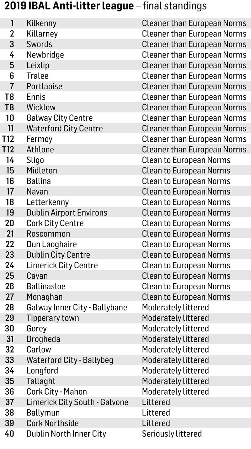 The annual review by the Irish Business Against Litter (Ibal) group finds Kilkenny city the cleanest of 40 towns, cities and urban areas surveyed, followed by Killarney in Co Kerry, Swords in Co Dublin, and Newbridge and Leixlip, both in Co Kildare.