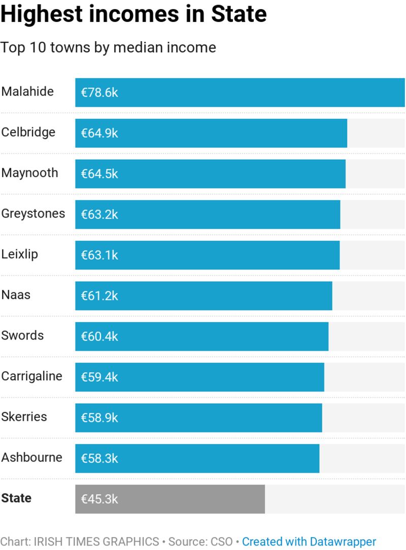 Households in Malahide had the highest median income (€78,631) of all 41 towns in Ireland with a population of 10,000 or more, (excluding the cities and suburbs of Dublin, Cork, Limerick, Galway and Waterford). Celbridge had the second highest at €64,877.