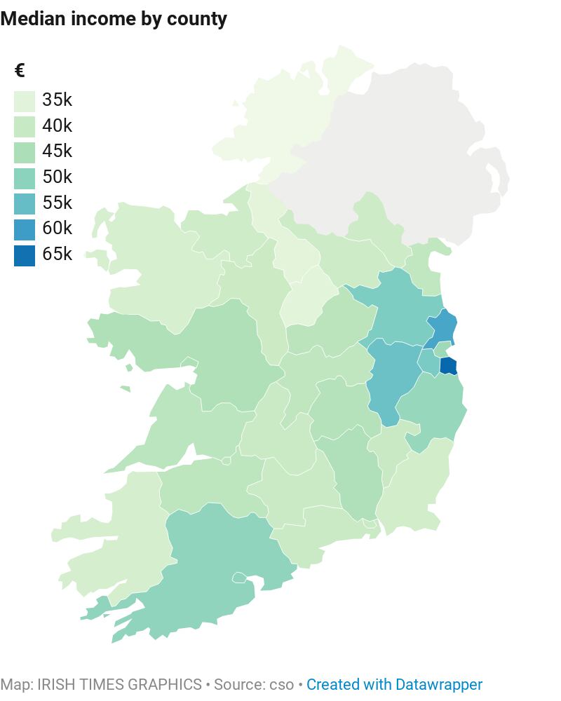 Households in Dún Laoghaire-Rathdown had the highest median income at €66,203, followed by Fingal (€58,795) and Kildare (€54,472). Households with the lowest incomes were in Donegal (€32,259), Leitrim (€34,800) and Longford (€34,892).
