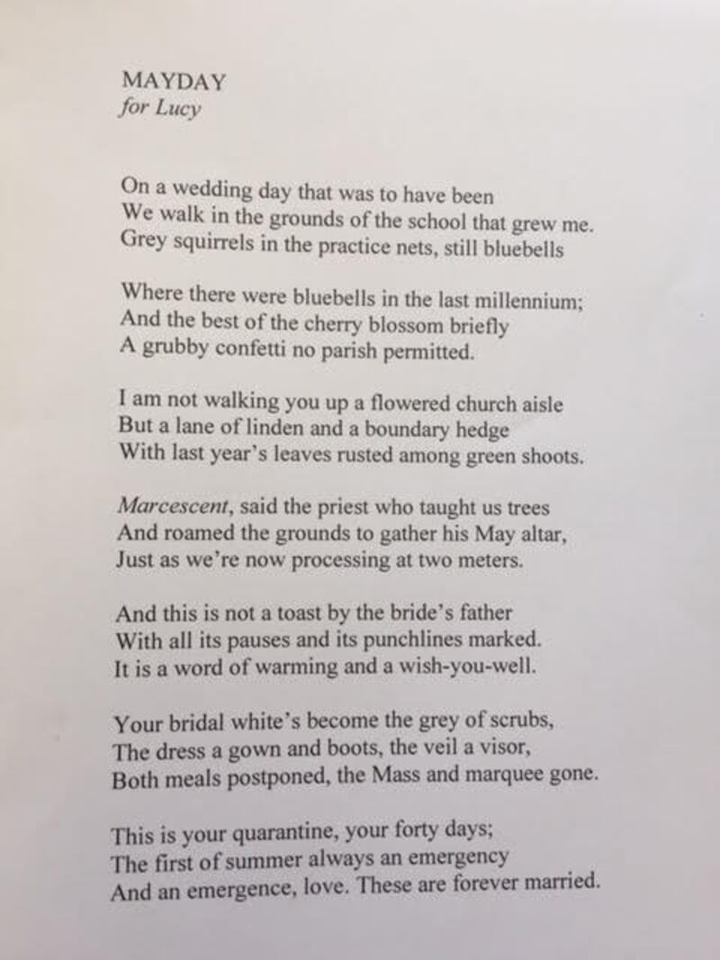 Her father, an author and RTÉ producer, later prepared the poem Mayday to mark the occasion. "Your bridal whites become the grey of scrubs/The dress a gown and boots, the veil a visor," he wrote.