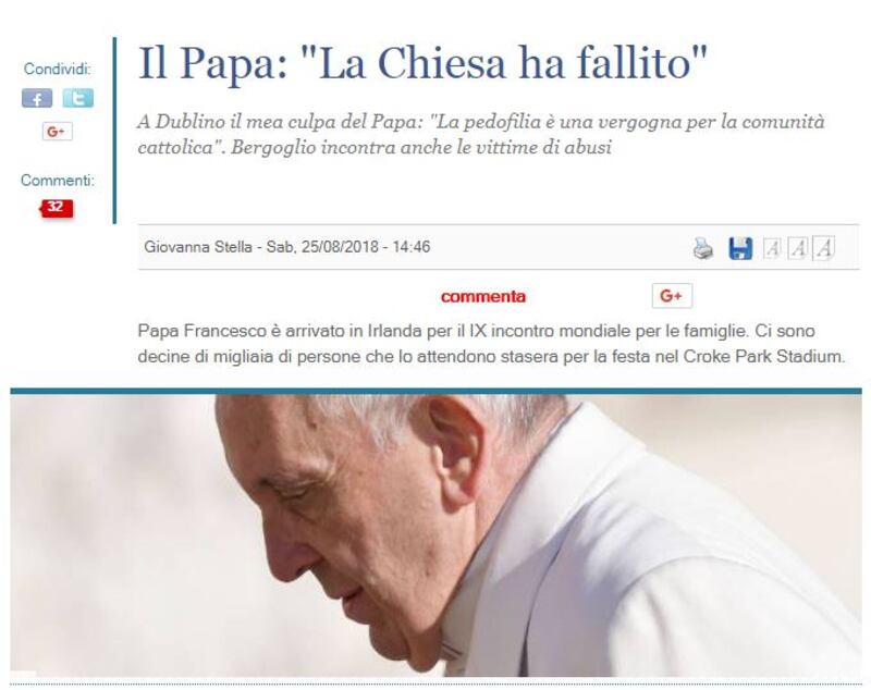 The Pope: 'The Church has failed': Ireland is a country deeply affected by this kind of scandal. And Bergoglio was the first Pope to set foot here after the four government reports that from 2005 to 2011 reveal decades of sexual violence and abuse on thousands of minors in Catholic institutions. For this reason his journey and for this between today and tomorrow the pope will meet in private form some victims of pedophile priests.