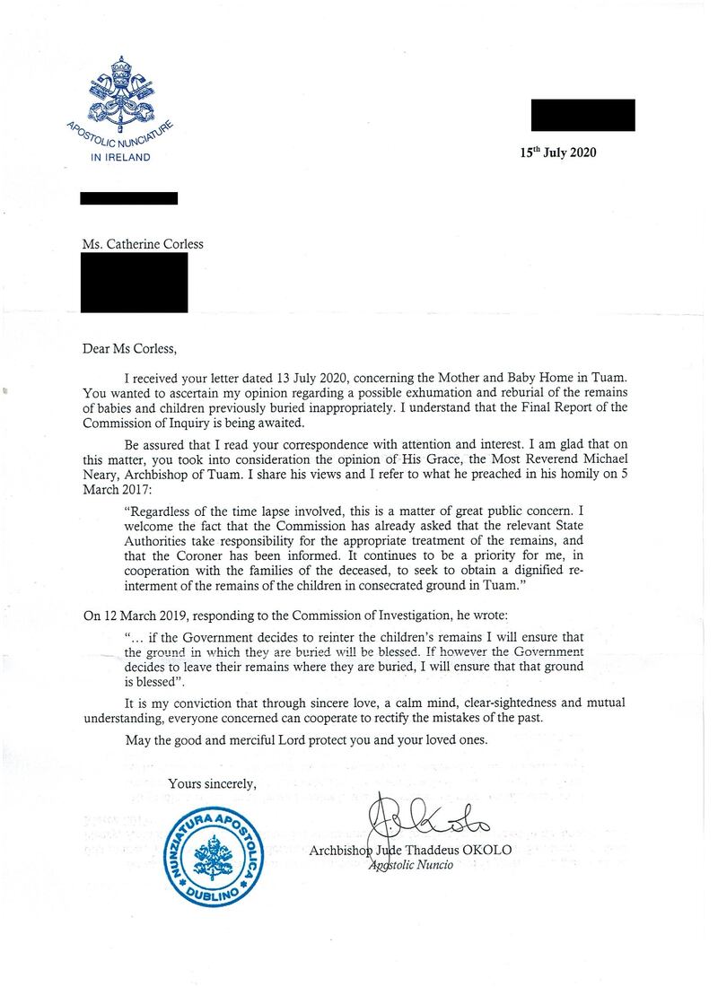 Historian Catherine Corless, who gathered death certificates for 796 infants linked to the home in Co Galway, has been told by the Papal Nuncio to Ireland that he shares Archbishop of Tuam Michael Neary's view that there should be a "dignified re-interment" of the remains in consecrated ground.